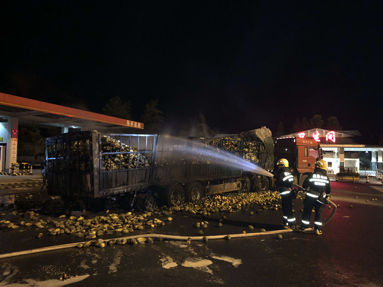 9月2日00时15分,乐雅高速监控中心接司乘人员报警:一辆满载水果货车行驶在乐雅高速雅安至乐山方向时发生车辆自燃,司机不就地停车,执意往前开。监控中心接报后立即将情况报119,并报告高速交警、高速执法、路产管护大队。