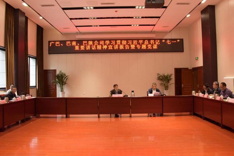 为深入学习贯彻习近平总书记在庆祝中国共产党成立100周年大会上的重要讲话精神,推动党史学习教育走深走实。10月14日,巴陕、巴南、广巴公司党委书记、董事长蔡新川作了学习贯彻习近平总书记“七一”重要讲话精神宣讲报告暨专题党课。巴陕、巴南、广巴公司党委副书记、总经理方家华同志主持宣讲报告暨专题党课,三家公司其他领导班子成员,各部门、管理处负责人及部分党员代表参加宣讲暨专题党课。